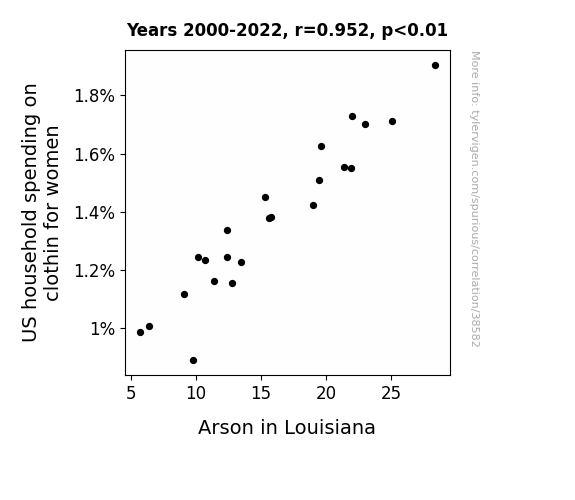 This means 90.7% of the change in the one variable (i.e., Arson in Louisiana) is predictable based on the change in the other (i.e., US household spending on clothin for women) over the 23 years from 2000 through 2022.