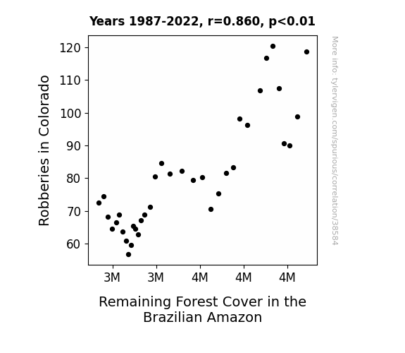 This means 74% of the change in the one variable (i.e., Remaining Forest Cover in the Brazilian Amazon) is predictable based on the change in the other (i.e., Robberies in Colorado) over the 36 years from 1987 through 2022.
