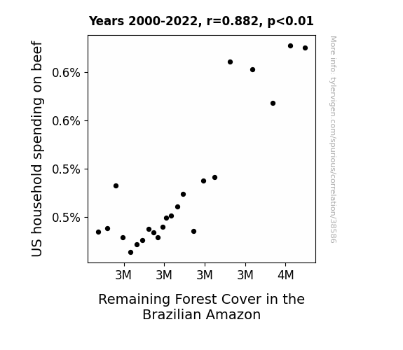 This means 77.9% of the change in the one variable (i.e., Remaining Forest Cover in the Brazilian Amazon) is predictable based on the change in the other (i.e., US household spending on beef) over the 23 years from 2000 through 2022.