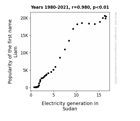 This means 96.1% of the change in the one variable (i.e., Electricity generation in Sudan) is predictable based on the change in the other (i.e., Popularity of the first name Liam) over the 42 years from 1980 through 2021.