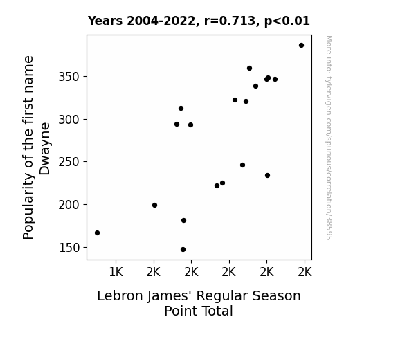 This means 50.8% of the change in the one variable (i.e., Lebron James' Regular Season Point Total) is predictable based on the change in the other (i.e., Popularity of the first name Dwayne) over the 19 years from 2004 through 2022.