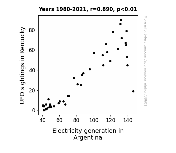 This means 79.3% of the change in the one variable (i.e., Electricity generation in Argentina) is predictable based on the change in the other (i.e., UFO sightings in Kentucky) over the 42 years from 1980 through 2021.