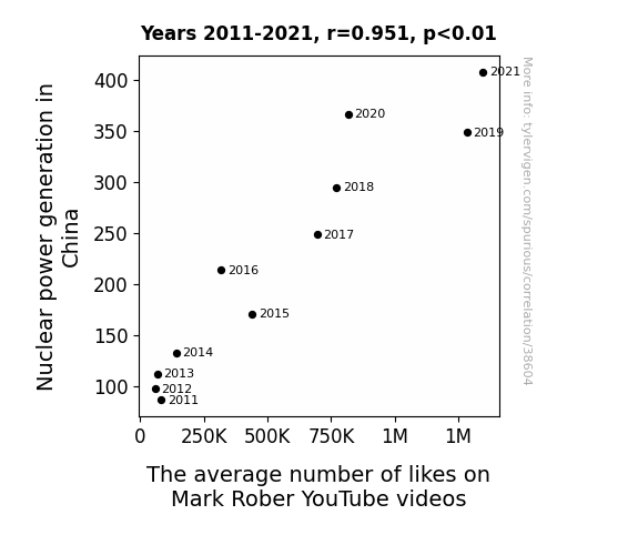 This means 90.5% of the change in the one variable (i.e., The average number of likes on Mark Rober YouTube videos) is predictable based on the change in the other (i.e., Nuclear power generation in China) over the 11 years from 2011 through 2021.