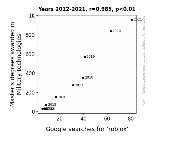 This means 96.9% of the change in the one variable (i.e., Google searches for 'roblox') is predictable based on the change in the other (i.e., Master's degrees awarded in Military technologies) over the 10 years from 2012 through 2021.