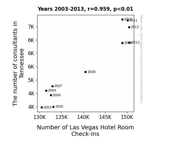 This means 92% of the change in the one variable (i.e., Number of Las Vegas Hotel Room Check-Ins) is predictable based on the change in the other (i.e., The number of consultants in Tennessee) over the 11 years from 2003 through 2013.