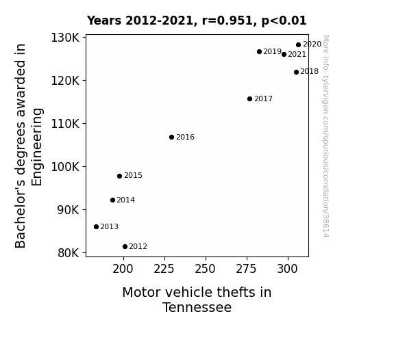 This means 90.5% of the change in the one variable (i.e., Motor vehicle thefts in Tennessee) is predictable based on the change in the other (i.e., Bachelor's degrees awarded in Engineering) over the 10 years from 2012 through 2021.