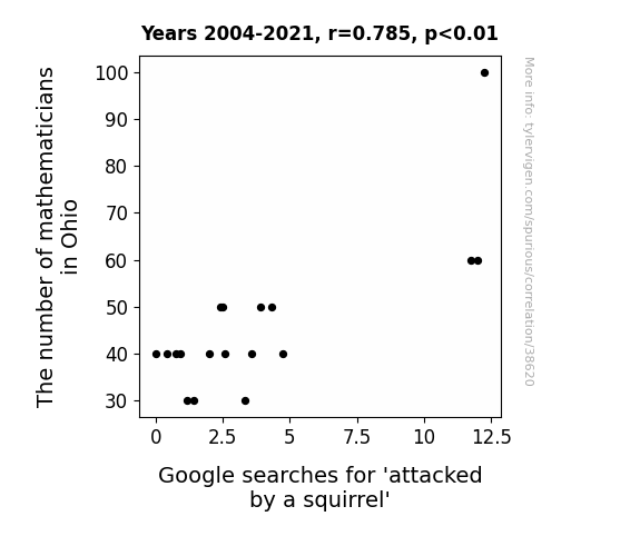 This means 61.6% of the change in the one variable (i.e., Google searches for 'attacked by a squirrel') is predictable based on the change in the other (i.e., The number of mathematicians in Ohio) over the 18 years from 2004 through 2021.