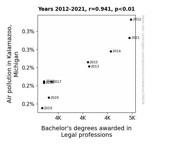 This means 88.5% of the change in the one variable (i.e., Bachelor's degrees awarded in Legal professions) is predictable based on the change in the other (i.e., Air pollution in Kalamazoo, Michigan) over the 10 years from 2012 through 2021.