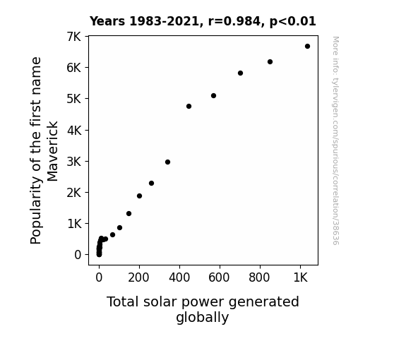 This means 96.9% of the change in the one variable (i.e., Total solar power generated globally) is predictable based on the change in the other (i.e., Popularity of the first name Maverick) over the 39 years from 1983 through 2021.