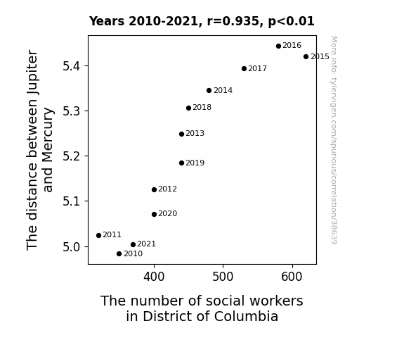 This means 87.4% of the change in the one variable (i.e., The number of social workers in District of Columbia) is predictable based on the change in the other (i.e., The distance between Jupiter and Mercury) over the 12 years from 2010 through 2021.