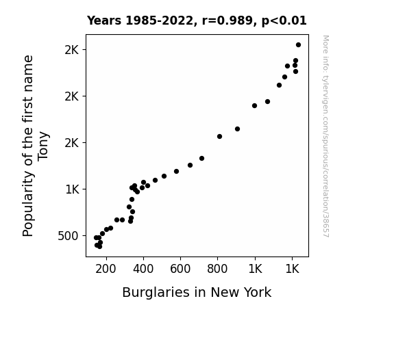 This means 97.7% of the change in the one variable (i.e., Burglaries in New York) is predictable based on the change in the other (i.e., Popularity of the first name Tony) over the 38 years from 1985 through 2022.