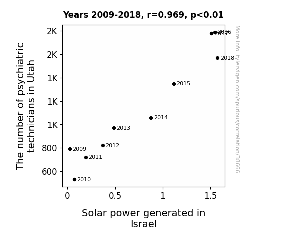 This means 93.8% of the change in the one variable (i.e., Solar power generated in Israel) is predictable based on the change in the other (i.e., The number of psychiatric technicians in Utah) over the 10 years from 2009 through 2018.