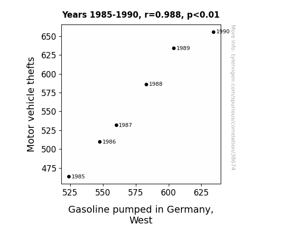 This means 97.5% of the change in the one variable (i.e., Gasoline pumped in Germany, West) is predictable based on the change in the other (i.e., Motor vehicle thefts) over the 6 years from 1985 through 1990.