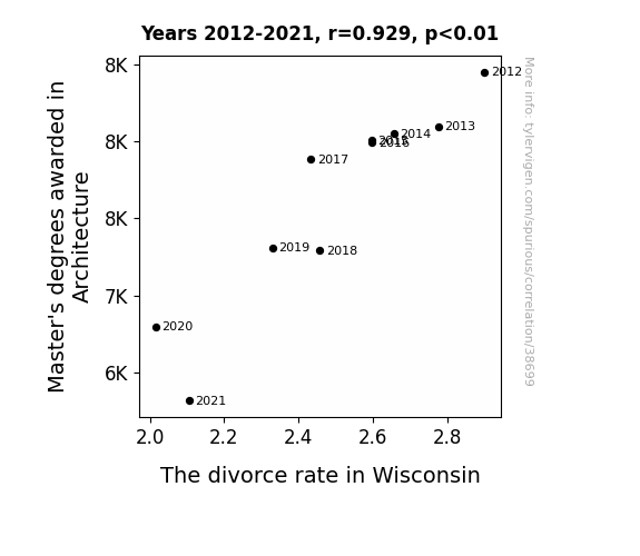 This means 86.4% of the change in the one variable (i.e., The divorce rate in Wisconsin) is predictable based on the change in the other (i.e., Master's degrees awarded in Architecture) over the 10 years from 2012 through 2021.