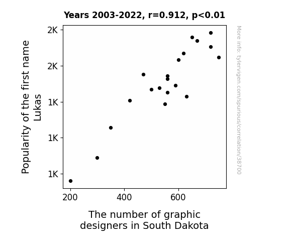 This means 83.1% of the change in the one variable (i.e., The number of graphic designers in South Dakota) is predictable based on the change in the other (i.e., Popularity of the first name Lukas) over the 20 years from 2003 through 2022.