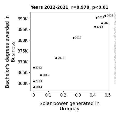 This means 95.6% of the change in the one variable (i.e., Solar power generated in Uruguay) is predictable based on the change in the other (i.e., Bachelor's degrees awarded in Business) over the 10 years from 2012 through 2021.