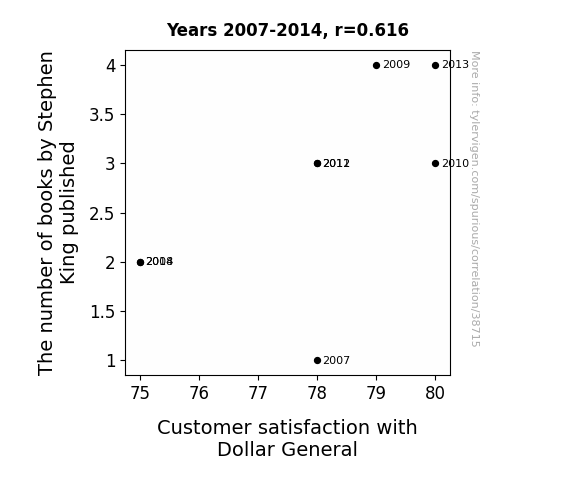 This means 38% of the change in the one variable (i.e., Customer satisfaction with Dollar General) is predictable based on the change in the other (i.e., The number of books by Stephen King published) over the 8 years from 2007 through 2014.