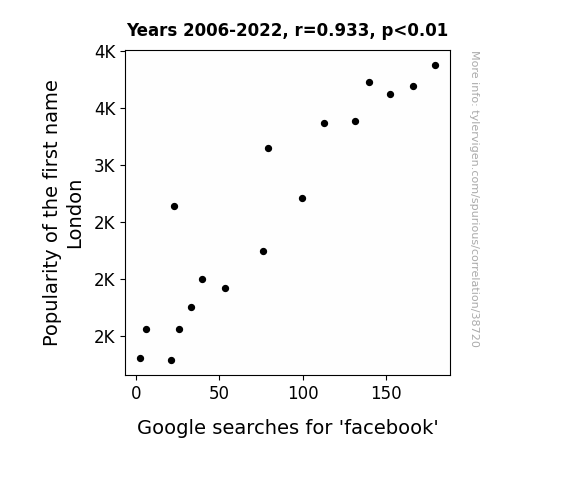 This means 87% of the change in the one variable (i.e., Google searches for 'facebook') is predictable based on the change in the other (i.e., Popularity of the first name London) over the 17 years from 2006 through 2022.