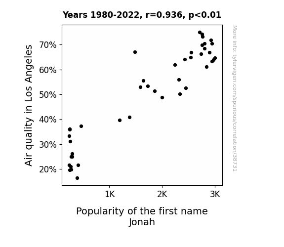 This means 87.7% of the change in the one variable (i.e., Popularity of the first name Jonah) is predictable based on the change in the other (i.e., Air quality in Los Angeles) over the 43 years from 1980 through 2022.