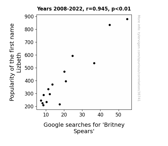 This means 89.3% of the change in the one variable (i.e., Google searches for 'Britney Spears') is predictable based on the change in the other (i.e., Popularity of the first name Lizbeth) over the 15 years from 2008 through 2022.