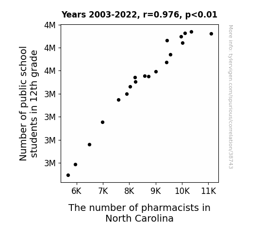 This means 95.2% of the change in the one variable (i.e., The number of pharmacists in North Carolina) is predictable based on the change in the other (i.e., Number of public school students in 12th grade) over the 20 years from 2003 through 2022.