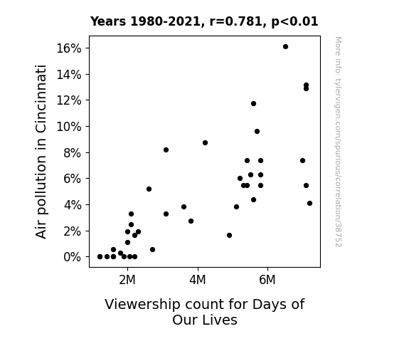 This means 61% of the change in the one variable (i.e., Viewership count for Days of Our Lives) is predictable based on the change in the other (i.e., Air pollution in Cincinnati) over the 42 years from 1980 through 2021.