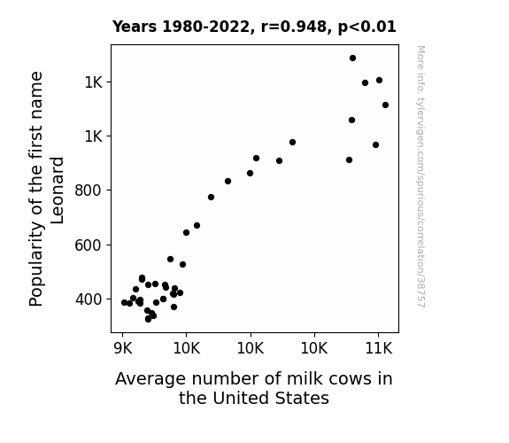 This means 89.9% of the change in the one variable (i.e., Average number of milk cows in the United States) is predictable based on the change in the other (i.e., Popularity of the first name Leonard) over the 43 years from 1980 through 2022.