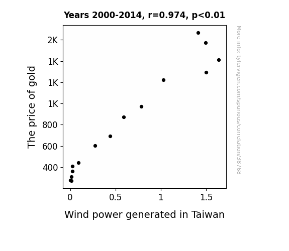 This means 94.9% of the change in the one variable (i.e., Wind power generated in Taiwan) is predictable based on the change in the other (i.e., The price of gold) over the 15 years from 2000 through 2014.