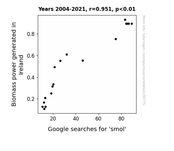This means 90.4% of the change in the one variable (i.e., Google searches for 'smol') is predictable based on the change in the other (i.e., Biomass power generated in Ireland) over the 18 years from 2004 through 2021.