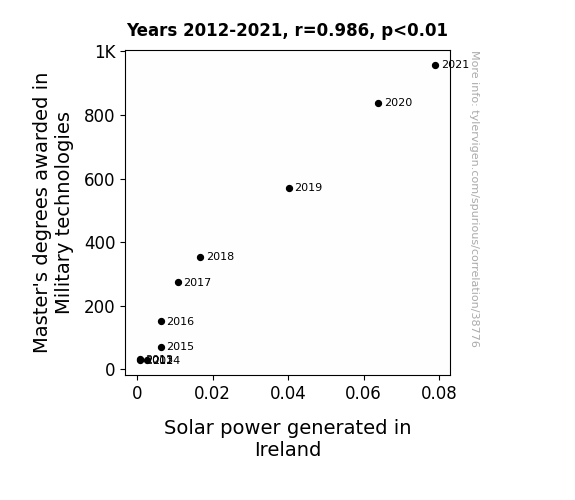 This means 97.2% of the change in the one variable (i.e., Solar power generated in Ireland) is predictable based on the change in the other (i.e., Master's degrees awarded in Military technologies) over the 10 years from 2012 through 2021.
