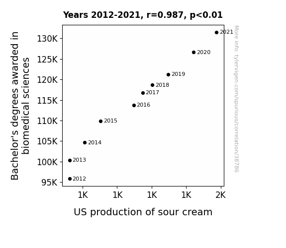 This means 97.4% of the change in the one variable (i.e., US production of sour cream) is predictable based on the change in the other (i.e., Bachelor's degrees awarded in biomedical sciences) over the 10 years from 2012 through 2021.