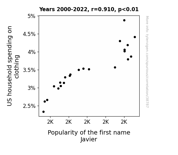 This means 82.8% of the change in the one variable (i.e., Popularity of the first name Javier) is predictable based on the change in the other (i.e., US household spending on clothing) over the 23 years from 2000 through 2022.
