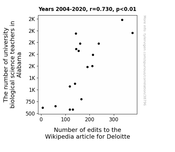 This means 53.3% of the change in the one variable (i.e., Number of edits to the Wikipedia article for Deloitte) is predictable based on the change in the other (i.e., The number of university biological science teachers in Alabama) over the 17 years from 2004 through 2020.