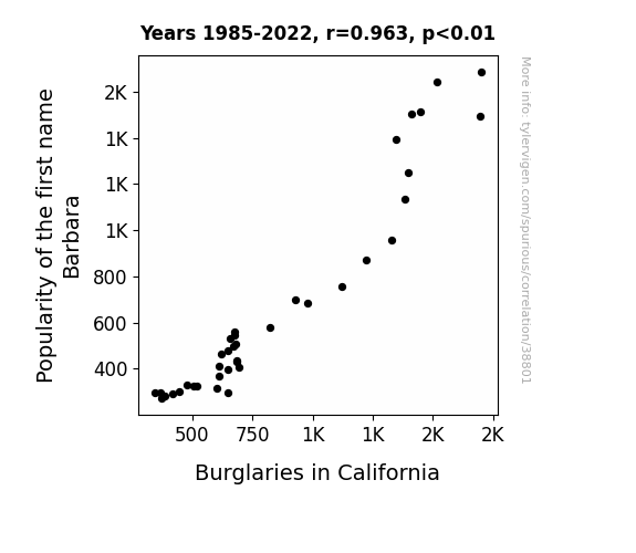 This means 92.7% of the change in the one variable (i.e., Burglaries in California) is predictable based on the change in the other (i.e., Popularity of the first name Barbara) over the 38 years from 1985 through 2022.