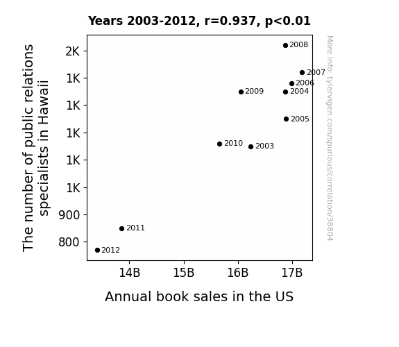 This means 87.9% of the change in the one variable (i.e., Annual book sales in the US) is predictable based on the change in the other (i.e., The number of public relations specialists in Hawaii) over the 10 years from 2003 through 2012.