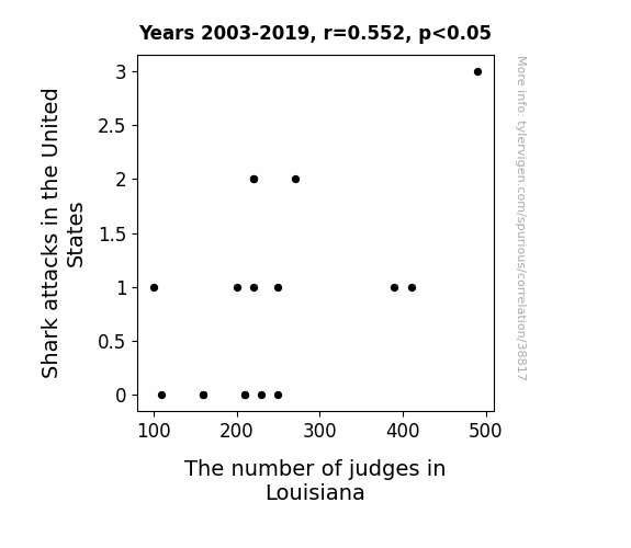 This means 30.5% of the change in the one variable (i.e., The number of judges in Louisiana) is predictable based on the change in the other (i.e., Shark attacks in the United States) over the 17 years from 2003 through 2019.