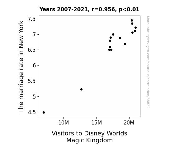 This means 91.4% of the change in the one variable (i.e., Visitors to Disney Worlds Magic Kingdom) is predictable based on the change in the other (i.e., The marriage rate in New York) over the 15 years from 2007 through 2021.