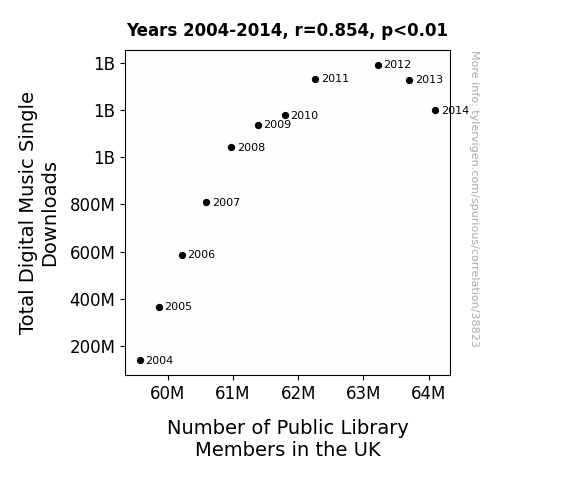 This means 73% of the change in the one variable (i.e., Number of Public Library Members in the UK) is predictable based on the change in the other (i.e., Total Digital Music Single Downloads) over the 11 years from 2004 through 2014.