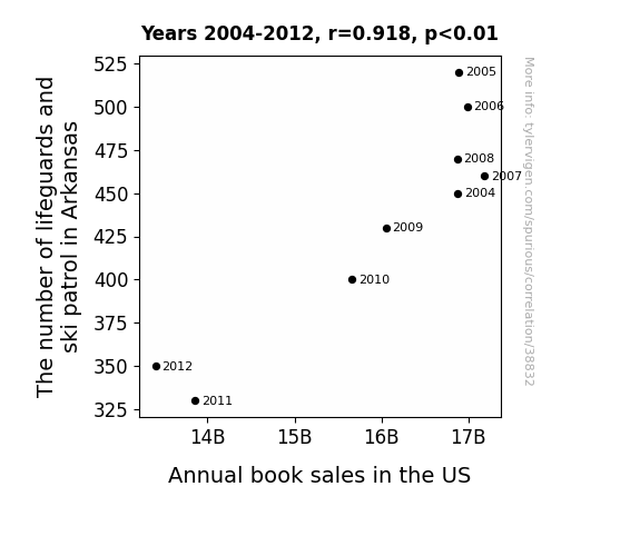 This means 84.2% of the change in the one variable (i.e., Annual book sales in the US) is predictable based on the change in the other (i.e., The number of lifeguards and ski patrol in Arkansas) over the 9 years from 2004 through 2012.