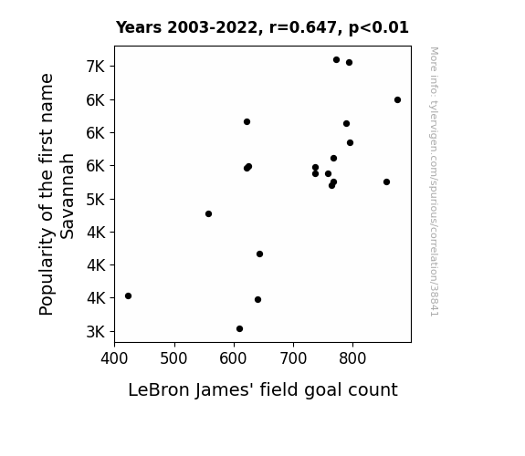 This means 41.9% of the change in the one variable (i.e., LeBron James' field goal count) is predictable based on the change in the other (i.e., Popularity of the first name Savannah) over the 20 years from 2003 through 2022.