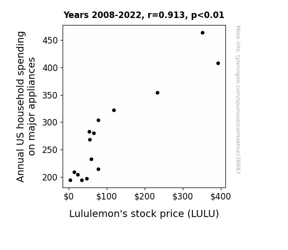 This means 83.4% of the change in the one variable (i.e., Lululemon's stock price (LULU)) is predictable based on the change in the other (i.e., Annual US household spending on major appliances) over the 15 years from 2008 through 2022.