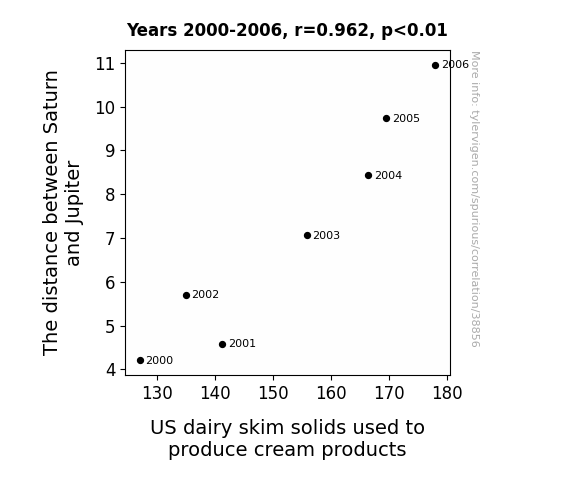 This means 92.6% of the change in the one variable (i.e., US dairy skim solids used to produce cream products) is predictable based on the change in the other (i.e., The distance between Saturn and Jupiter) over the 7 years from 2000 through 2006.