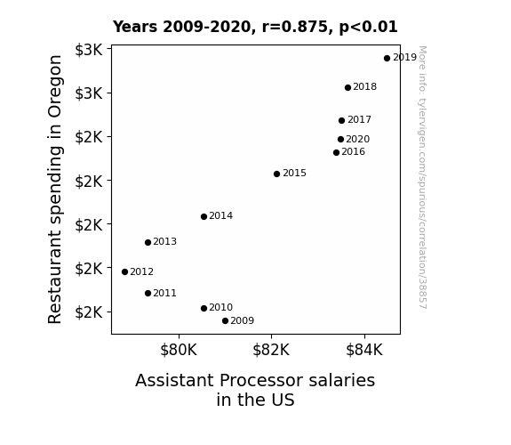 This means 76.6% of the change in the one variable (i.e., Assistant Processor salaries in the US) is predictable based on the change in the other (i.e., Restaurant spending in Oregon) over the 12 years from 2009 through 2020.