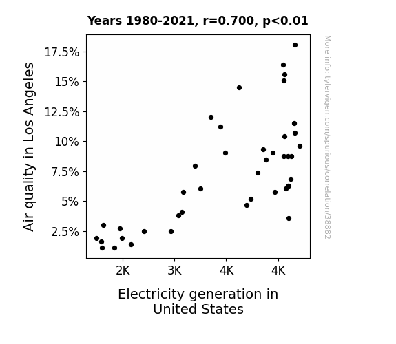 This means 49% of the change in the one variable (i.e., Electricity generation in United States) is predictable based on the change in the other (i.e., Air quality in Los Angeles) over the 42 years from 1980 through 2021.