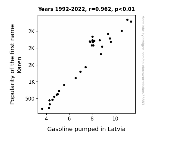 This means 92.6% of the change in the one variable (i.e., Gasoline pumped in Latvia) is predictable based on the change in the other (i.e., Popularity of the first name Karen) over the 31 years from 1992 through 2022.
