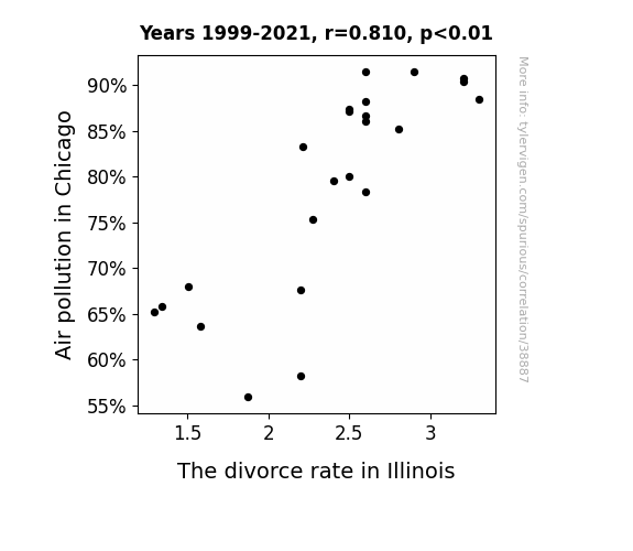 This means 65.5% of the change in the one variable (i.e., The divorce rate in Illinois) is predictable based on the change in the other (i.e., Air pollution in Chicago) over the 23 years from 1999 through 2021.