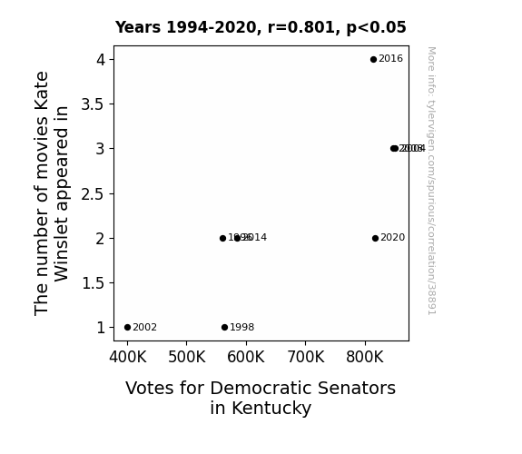 This means 64.1% of the change in the one variable (i.e., Votes for Democratic Senators in Kentucky) is predictable based on the change in the other (i.e., The number of movies Kate Winslet appeared in) over the 8 years from 1994 through 2020.