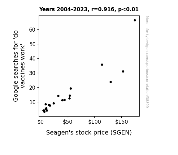 This means 83.9% of the change in the one variable (i.e., Seagen's stock price (SGEN)) is predictable based on the change in the other (i.e., Google searches for 'do vaccines work') over the 20 years from 2004 through 2023.