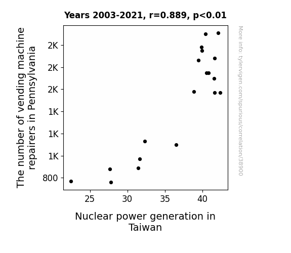 This means 79.1% of the change in the one variable (i.e., Nuclear power generation in Taiwan) is predictable based on the change in the other (i.e., The number of vending machine repairers in Pennsylvania) over the 19 years from 2003 through 2021.