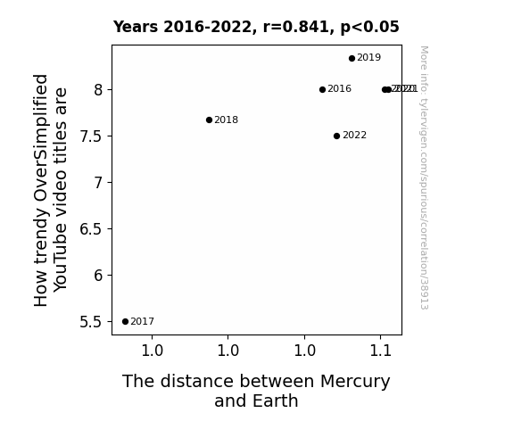 This means 70.8% of the change in the one variable (i.e., The distance between Mercury and Earth) is predictable based on the change in the other (i.e., How trendy OverSimplified YouTube video titles are) over the 7 years from 2016 through 2022.